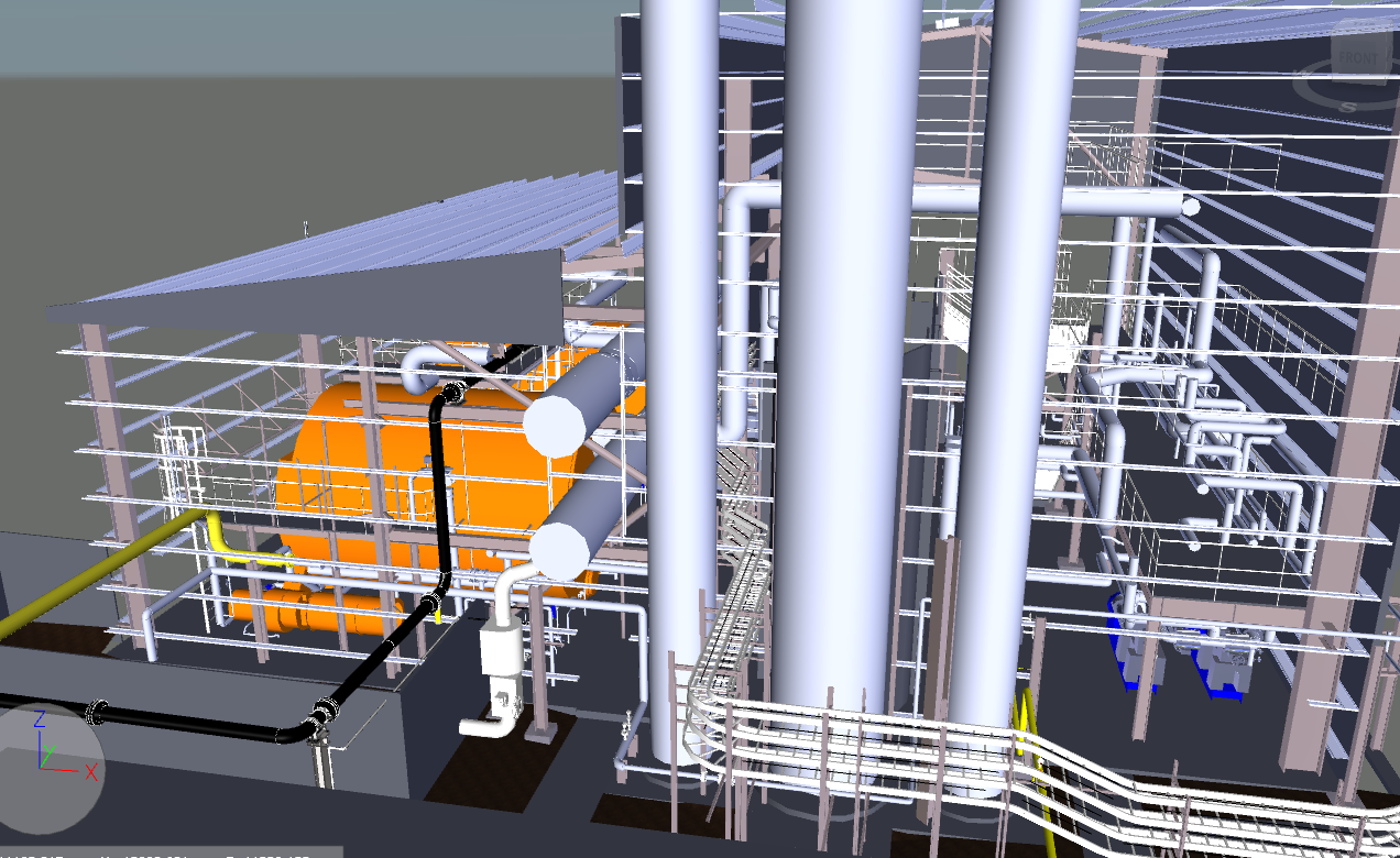 Our Client asked ScanView to provide 3D laser scanning to point cloud data that creates ultra-high accurate measurements of the Astra Zeneca plant and then create a CAD model of the pointcloud to include the area highlighted in yellow below, this included; Pipework, Superstructure internally and externally relative to the highlighted zone, medium and large assets i.e. boilers, cabinets, cable tray, stairs, handrailing etc. MEP assets >2” diameter.
